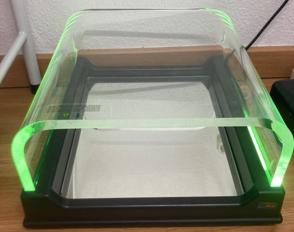 Herramientas para el estudio del aparato locomotor. El podoscopio permite analizar las estructuras del pie con plataforma LED iluminada, mientras que el escoliómetro evalúa la alineación de la columna y detecta posibles desviaciones por escoliosis.